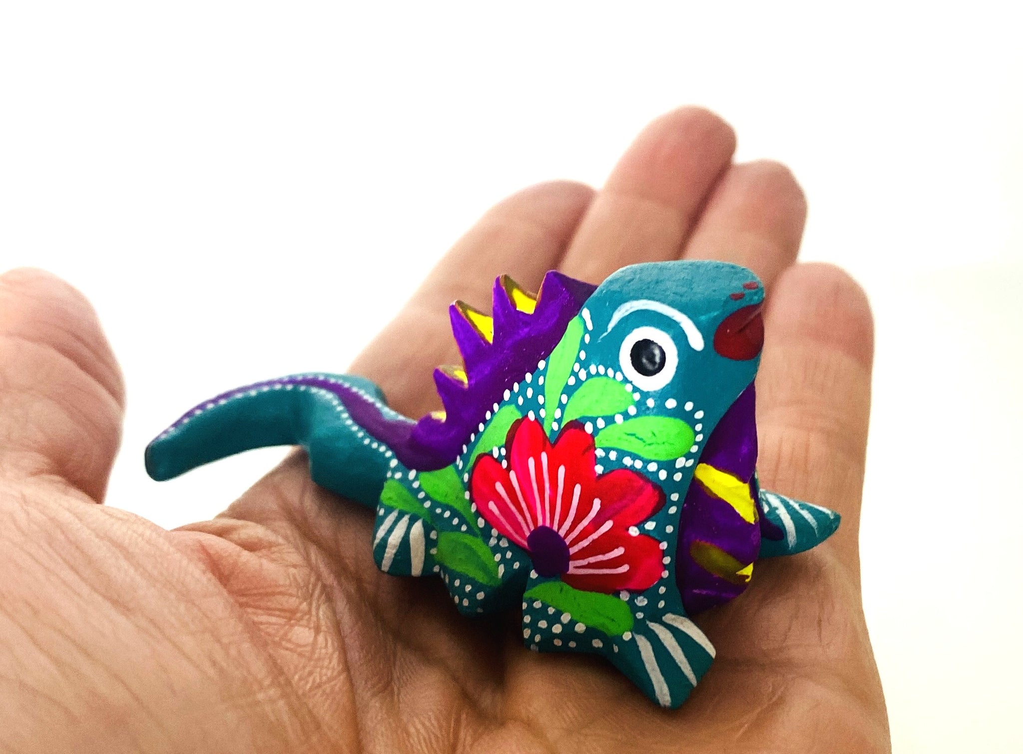 Made of copal wood. Carefully carved and painted by hand by our artisans from Oaxaca, Mexico.