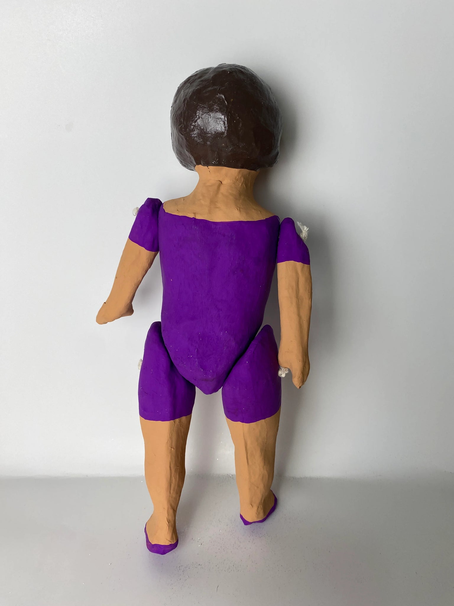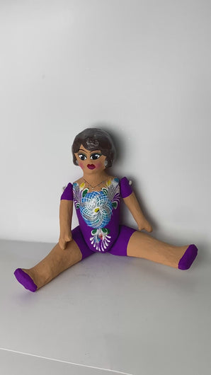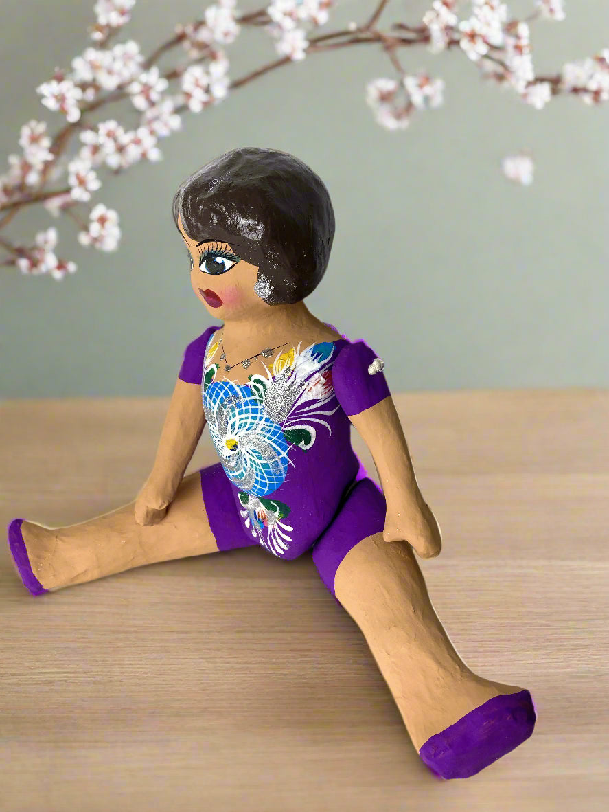 This papier-mâché technique is called cartonería. This doll has clothes painted in a style that looks like an old-fashion bathing suit and has glitter earrings and necklaces modeled after circus trapeze performers. The circus was very popular in Mexico at that time.