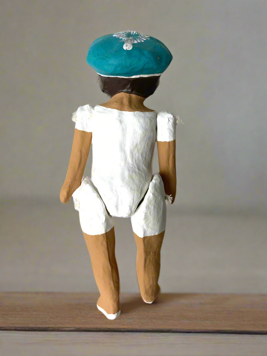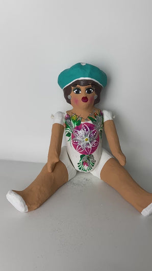 This papier-mâché technique is called cartonería. This doll has clothes painted in a style that looks like an old-fashion bathing suit and has glitter earrings and necklaces modeled after circus trapeze performers. The circus was very popular in Mexico at that time.