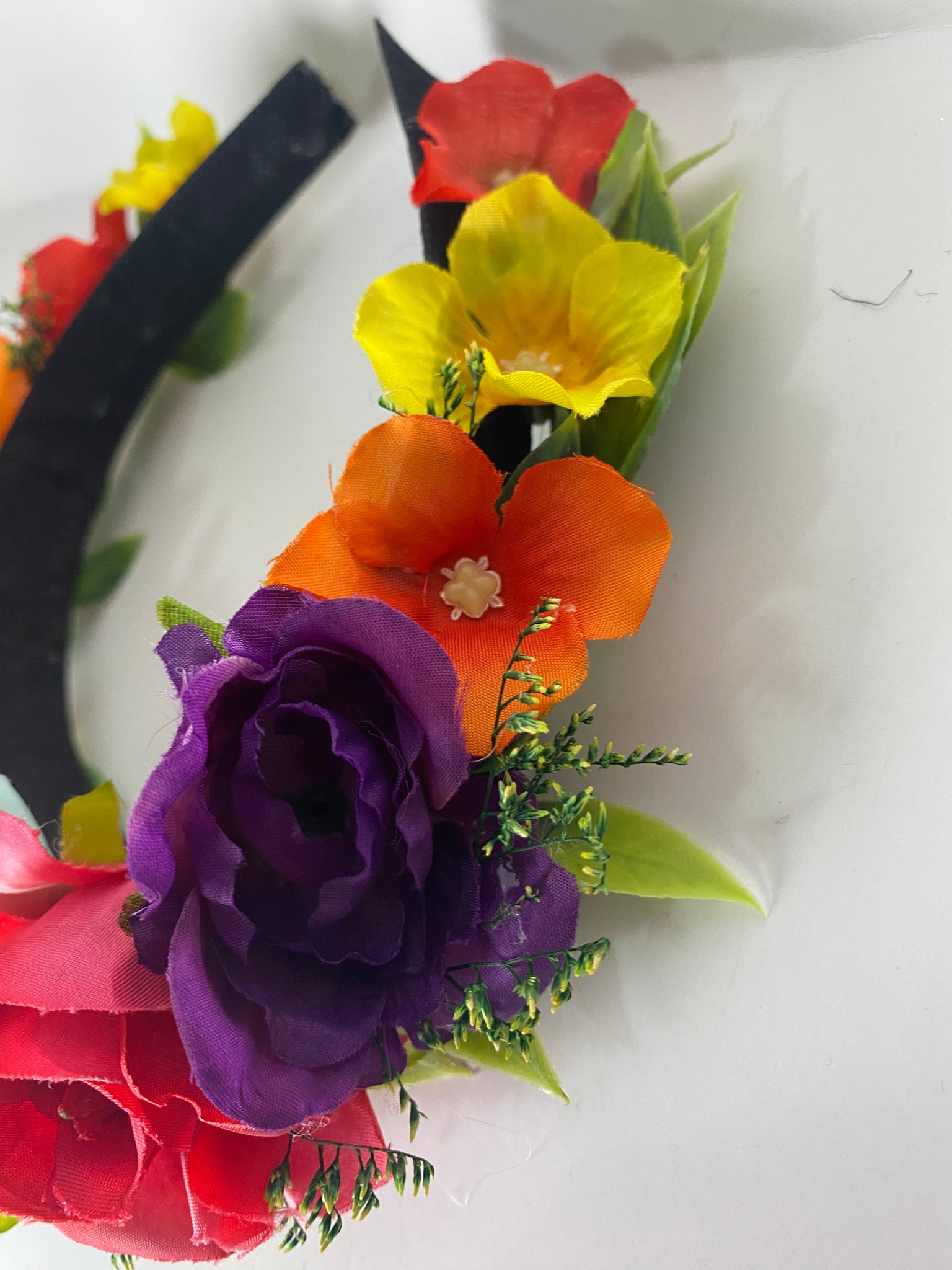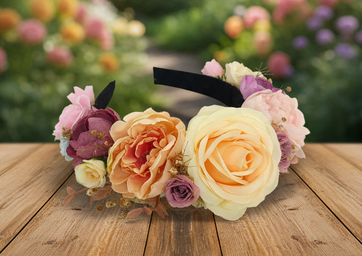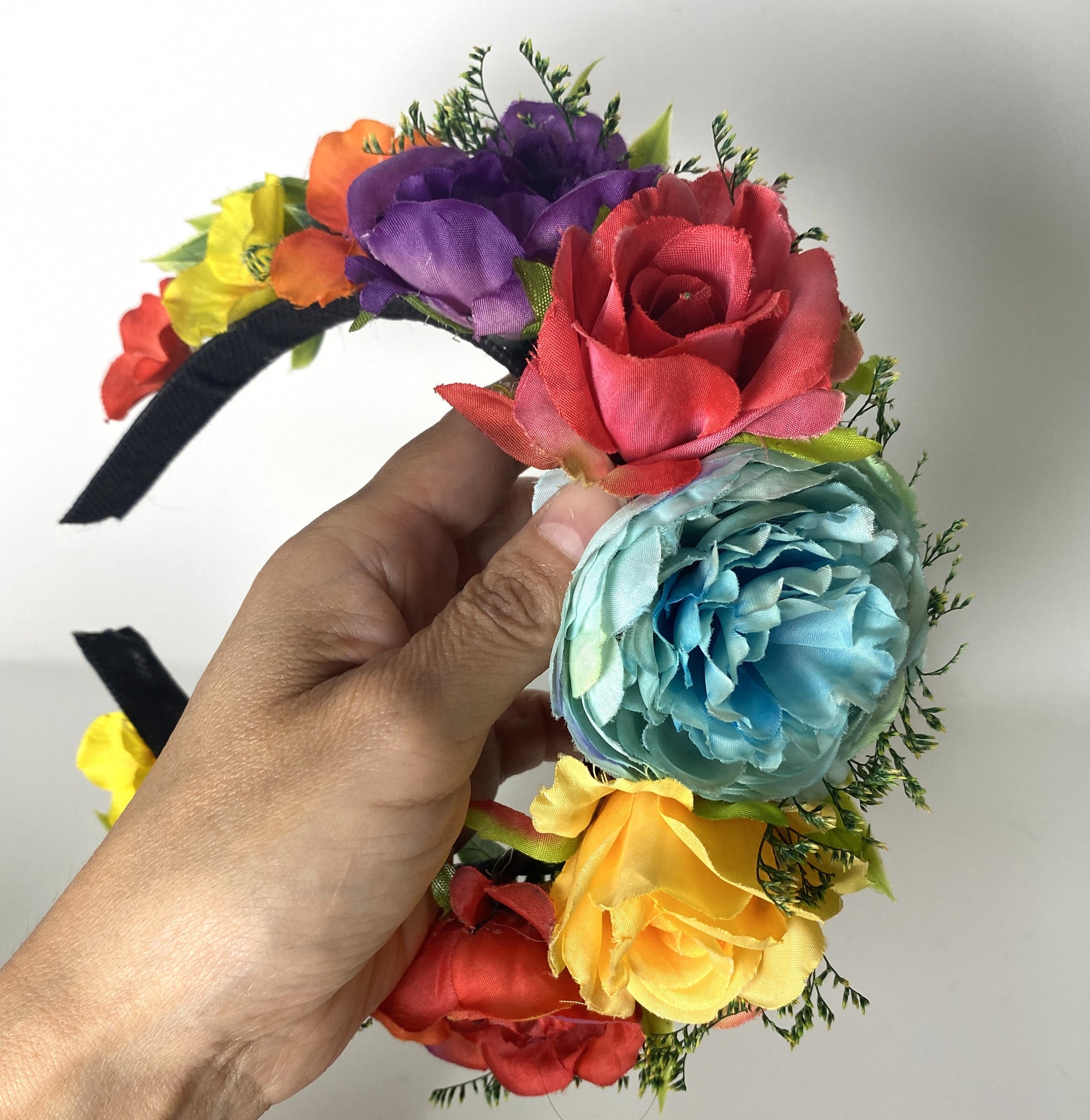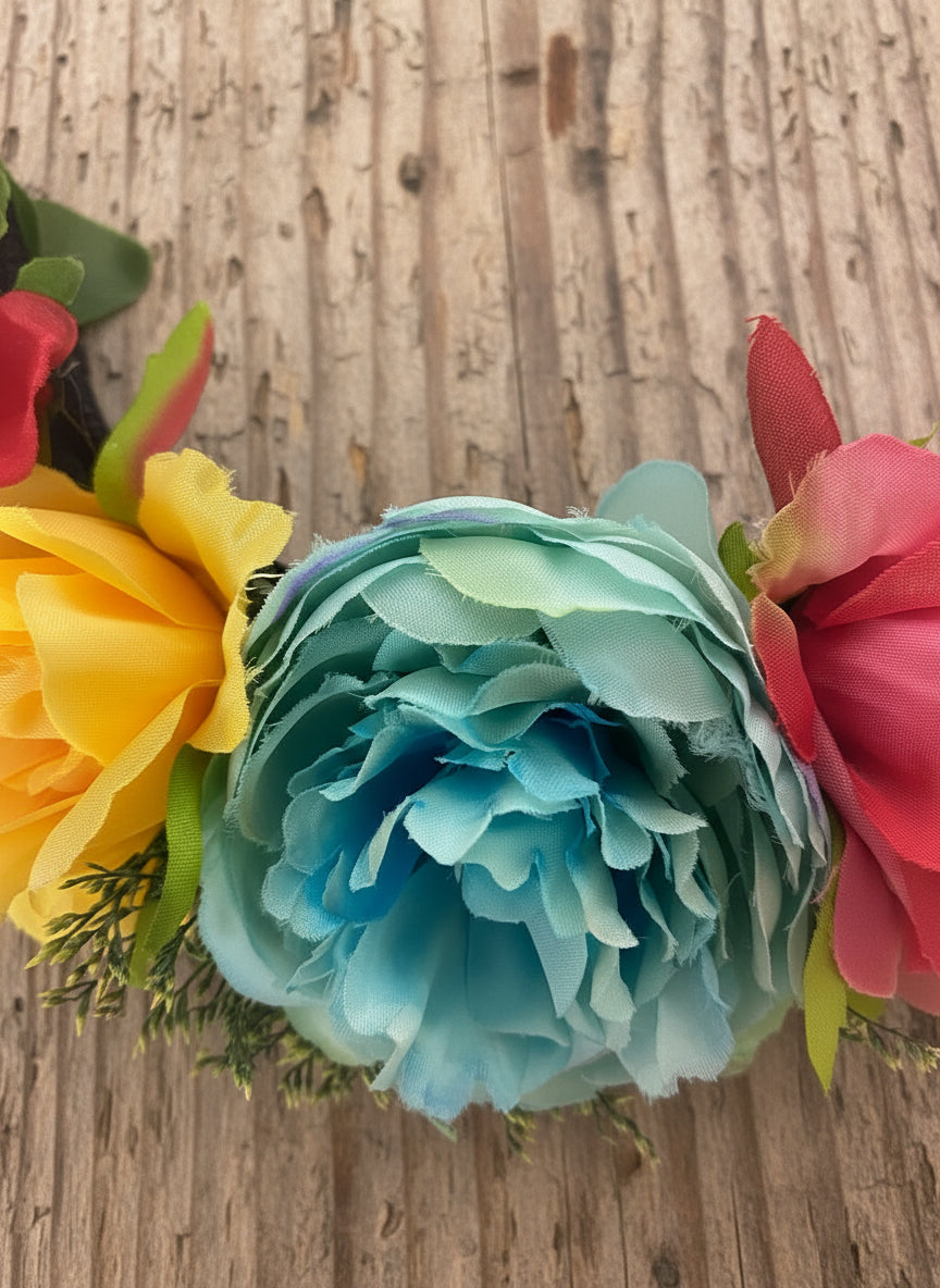 This is a beautiful Handmade floral headband with silk/fabric roses in varied colors.